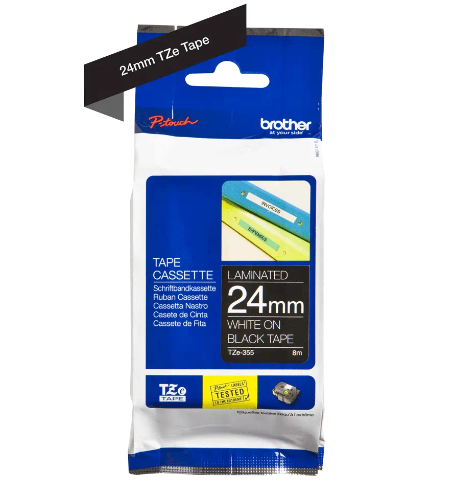 Cinta Brother TZE-355 Blanco sobre Negro 24mm (1″) x 8 mts